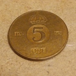 Ett 5-öres mynt präglat 1963. Myntet har en krona på framsidan och texten "5 ÖRE". Baksidan visar också en krona samt texten "GUSTAF VI ADOLF SVERIGES KONUNG".