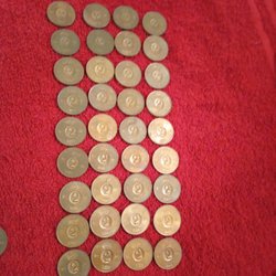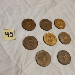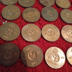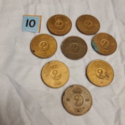 En samling av sju stycken 2 öre mynt från åren 1964, 1965, 1966, 1967, 1968, 1969, 1970 och 1971.