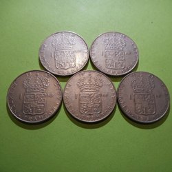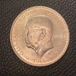 Ett svenskt 5 kronor från 1972 med Gustaf VI Adolfs porträtt. Valören är 5 kr. ”Plikten framför allt”