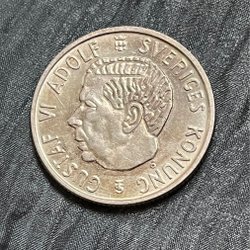 Silvermynt präglat med Gustaf VI Adolfs porträtt. År 1954. Valör: 2 kronor.