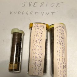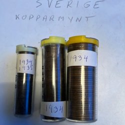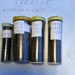Samling av svenska kopparmynt från olika årtal. Innehåller mynt från åren 1952, 1955, 1957, 1959, 1960, 1961, 1962, 1963, 1964, 1965 och 1966. Mynten förvaras i rör.