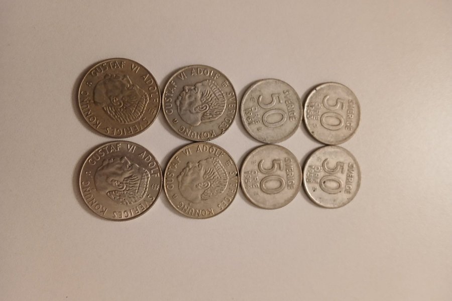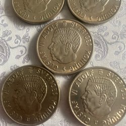 Samling av Gustaf VI Adolf minnesmynt. Inkluderar 50 öre från åren 1951, 1954 och 1958.4st 50 öre 4st 1kr