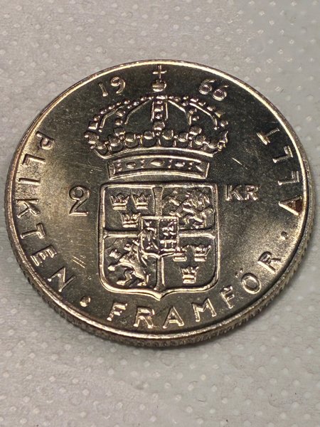Detta är en svensk 2 Kr från 1966. Framsidan visar Sveriges riksvapen med en krona ovanför. Runt kanten står texten "PLIKTEN FRAMFÖR ALLT" och årtalet 1966.