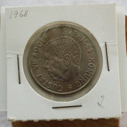 2kr från 1968 med Gustaf VI Adolf präglat på framsidan. Ursprung från Sverige.