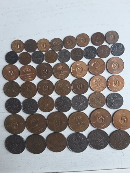 Parti med svenska ören från olika år och valörer. Innehåller 1 öre från 1957, 2 öre från 1958, 1959, 1960 och 1961 samt 5 öre från 1965, 1968 och 1970.30.40.50.60 tal