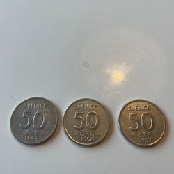 Fem svenska ören från olika år. Framsidan visar valören "5 ÖRE" och texten "SVERIGE". Baksidan visar monogrammet "C G XVI" med en krona och årtalet. Årtalen som ingår är 1976, 1979, 1980 och 1973..