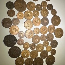 Samling av svenska ören från olika år. Framsidan visar valören och årtalet, medan baksidan har Sveriges riksvapen. Valörerna inkluderar 50 öre från åren 1945, 1946,1950,1952,