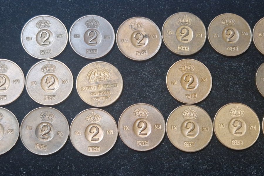 En samling av 2 öre från Sverige. Åren inkluderar 1953, 1954, 1955, 1956, 1957, 1958, 1959, 1960, 1961 TS, 1962, 1964, 1965, 1966, 1967, 1968, 1969, 1970 och 1971.
