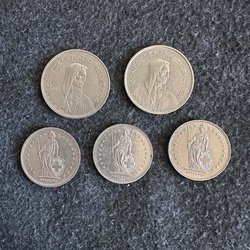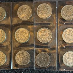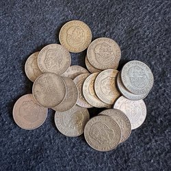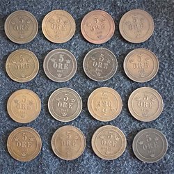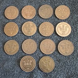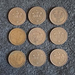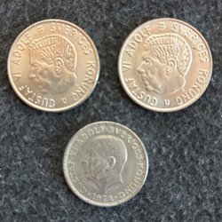 Nio svenska mynt. År: 1952, 1953, 1953, 1953, 1955, 1958, 1964, 1966, 1970 Värde: 2 KR.