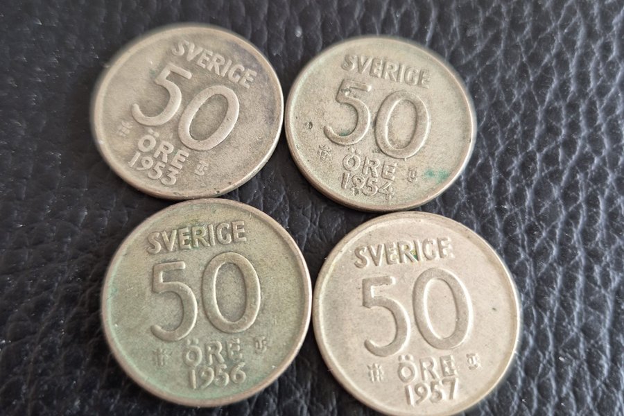 Fyra stycken 50 öre från Sverige. Årtalen är 1953, 1954, 1956 och 1957