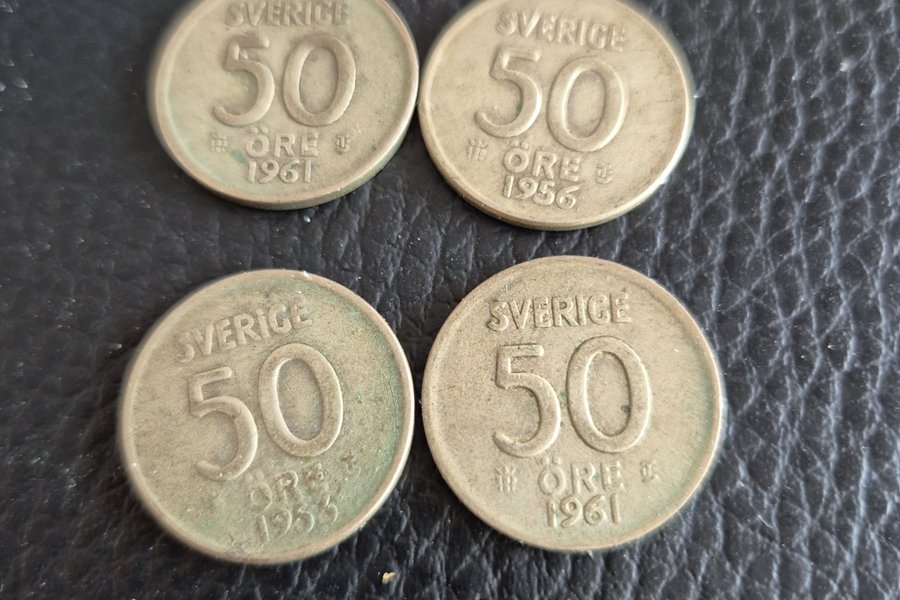 Fyra stycken svenska 50 öre. Två av mynten är från 1961, ett från 1956 och ett från 1953.