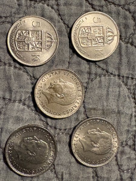 Fem (5) svenska riksdaler från 1972. Framsidan visar Konung Gustaf VI Adolf. Baksidan visar Sveriges riksvapen och valspråket 'Plikten framför allt'.