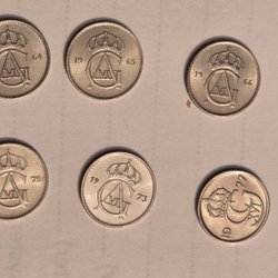 Samling av svenska kronor och ören. Innehåller 1 öre, 2 öre, 5 öre, 10 öre, 25 öre och 50 öre, samt 1 kronor och 5 kronor.