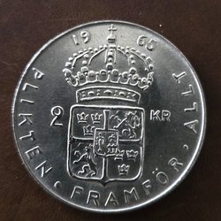 Ett svenskt mynt från 1965 med valören 2 kronor. Framsidan visar ett porträtt av Gustaf VI Adolf och texten ”GUSTAF VI ADOLF SVERIGES KONUNG”. Baksidan visar Sveriges riksvapen och texten ”PLIKTEN FRAMFÖR ALLT”.