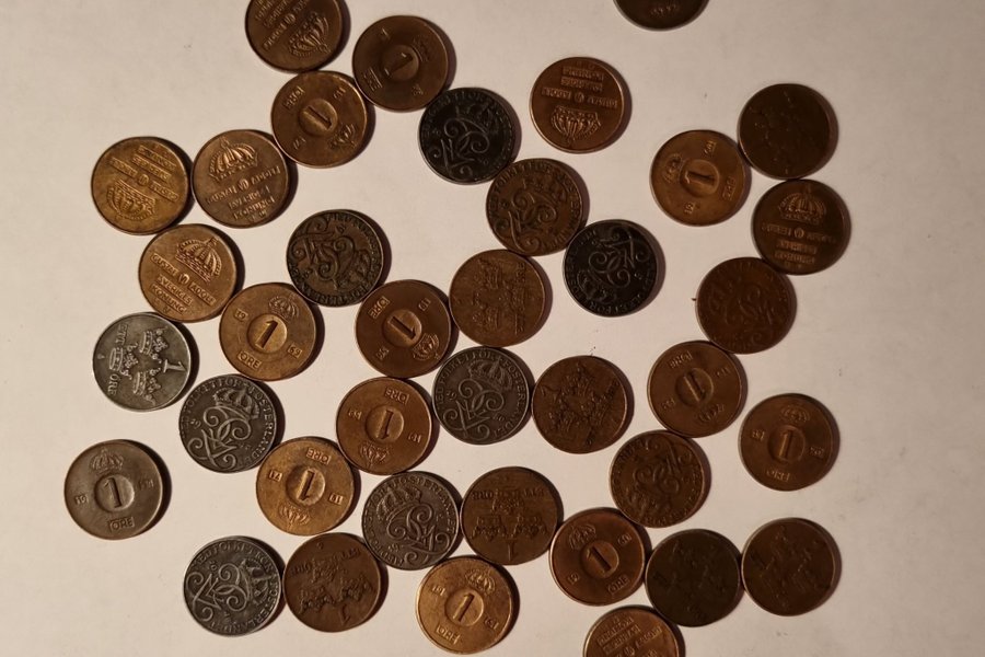 Parti med svenska mynt, 1-ören. Följande år finns; 1941-1971, dock saknas 1951, 1945 samt 1944.