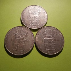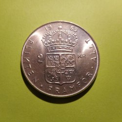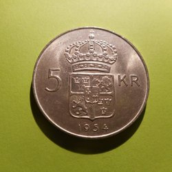 Ett samlarobjekt från 1953 med Gustaf VI Adolf präglat på framsidan och Sveriges riksvapen på baksidan. Valören är 1 KR.