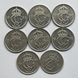 Svenska mynt präglade under Carl XVI Gustafs era berättar historien om en period av snabba förändringar, teknologiska framsteg, och sociala omvandlingar. Från 1970-talets industriella och kulturella blomstring till 2000-talets digitala revolution, har dessa mynt varit tysta vittnen till en dynamisk och ständigt föränderlig tid. Genom att samla på dem, blir man del av denna storslagna berättelse, sammanflätad i metall och tid. Om du bläddrar igenom Traderas rika utbud kommer du att stöta på en fascinerande samling av metalliska konstverk. Bland dessa finner man allt från jubileumsmynt, som firar speciella nationella evenemang eller årsdagar, till särskilda designförändringar som reflekterar tidsandan. Det finns också begränsade upplagor som endast präglades under en specifik period, vilka är särskilt värdefulla för samlare och historieentusiaster.