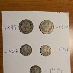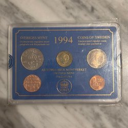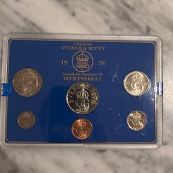 Samling av svenska mynt med årtalen 1963, 2 st.1965, 1966 och 2 st.1968. Valören är 1 Kr.