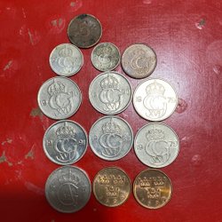 En krona 2009, jubileums mynt. 180 st. Både fina och lite sämre skick. Ett fåtal som är i sämre. 2 25 öringar 1940 och 1943. 13 st 10 öringar.