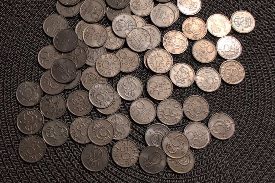 En samling av svenska 50-öringar från olika årtal. Inkluderar årtal som 1964. 1973, 1977, 1978, 1979 och 1980. Värdet är 50 öre per styck.