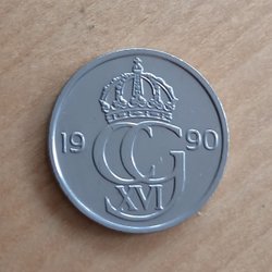 Svensk 50 öre från 1990. Insatt i en ny självhäftande myntficka som blir lufttät.Kvalitet på myntet är det bästa 10