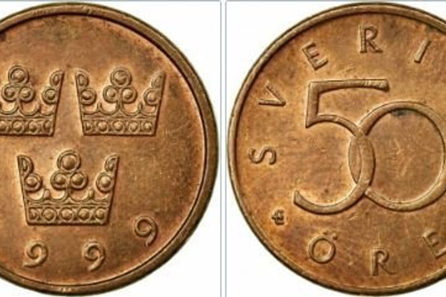 Ett 50 öre mynt från Sverige, präglat 1999.