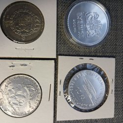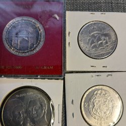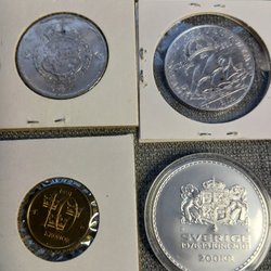 Samling av minnesmynt. Inkluderar ett 100 kronor minnesmynt från 1984, silver 925/1000, 16 gram. Ett annat mynt visar Konung Carl XVI Gustaf och Drottning Silvia.