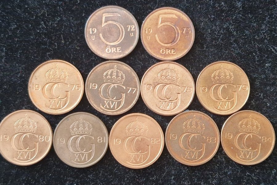 En samling av svenska 5-öres mynt Inkluderar 1972, 1973
