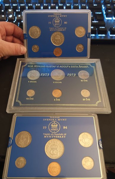 Ocirukulerade svenska mynt från 1980 , 1984 och 1973. Präglade och förpackade vid Myntverket.