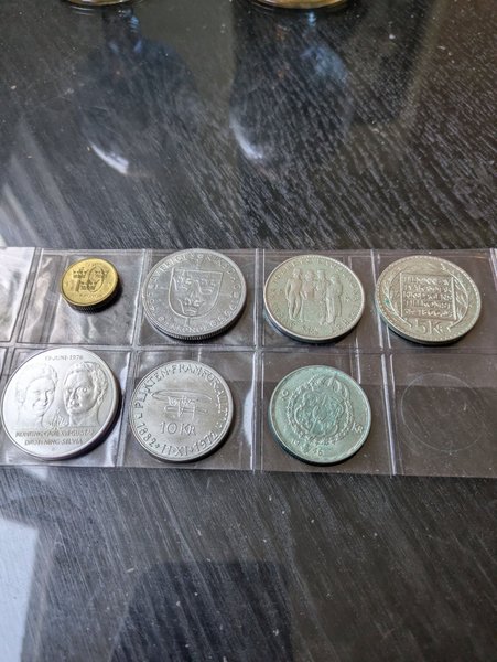 Parti med svenska mynt. Inkluderar ett 10 Kronor mynt från 1991, ett 5 Kronor mynt från 1935, ett 5 Kronor mynt från 1809, ett 5 Kronor mynt från 1866, ett 10 Kronor mynt från 1972, ett 2 Kronor mynt från 1946 och ett mynt från 1976 med Konung Carl XVI Gustaf och Drottning Silvia.