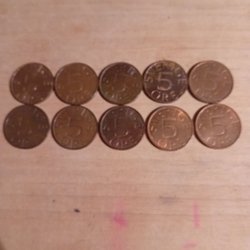 Parti med svenska ören. Föremålen är från 1980-talet Värdet är 5 öre.