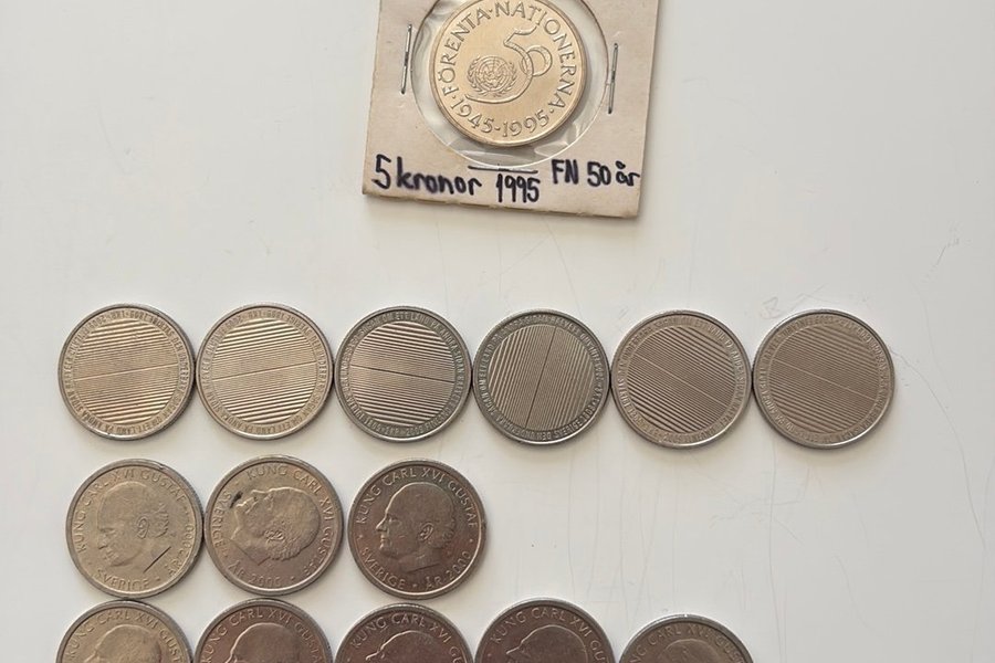 Parti med svenska mynt. Inkluderar ett 5-kronorsmynt från 1995 som firar FN:s 50-årsjubileum (1945-1995). Dessutom ingår flera mynt med kung Carl XVI Gustaf från år 2000.