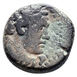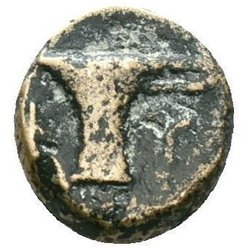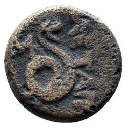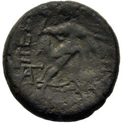 Frånsida: Lejonsprångande kerykeion. Grekisk text vertikal BASILEOS. Under lejon LYS