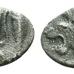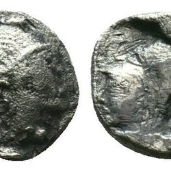 Rev: Grekisk text AIGAEON. Framdel av en get vänd till höger; monogram till vänster och höger.
