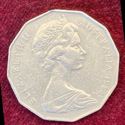 Detta är en 50-centare från Australien, präglad år 1975. Framsidan visar drottning Elizabeth II och baksidan visar Australiens statsvapen.