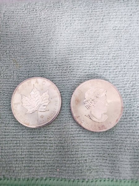 Detta är ett kanadensiskt silvermynt med ett lönnlöv på ena sidan och ett porträtt av drottning Elizabeth II 2 st 1oz 999,