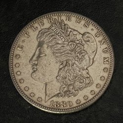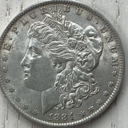 Morgan silverdollar från 1883. Framsidan visar ett porträtt av Lady Liberty och baksidan visar en örn med utbredda vingar. Myntet har ett värde av en dollar.