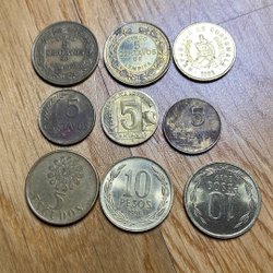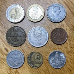 En samling av olika utländska valutor. Inkluderar valutor från Danmark (25 Öre, 10 Öre), Finland, Frankrike (1 Franc 1969) och andra länder. Årtal och valörer varierar.