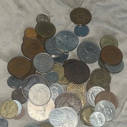Ett urval av olika valutor. Inkluderar en guld färgad medalj med årtalen 16 och 28. En Quarter Dollar från USA. En silverfärgad valuta med Gustaf V Sveriges Konung. En One Pound från Storbritannien 1983. En Five Cent från USA, präglad 1938.