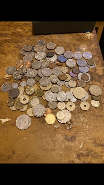 En samling av olika mynt Inkluderar en "5" från Tyskland. Säljes i befintligt skick