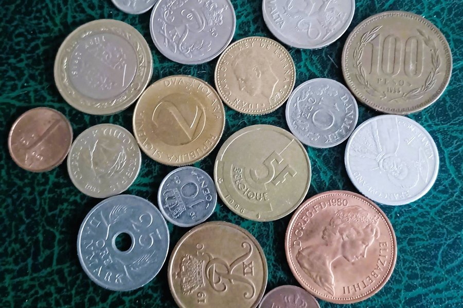 En samling av olika utländska valutor. Inkluderar mynt från bland annat Norge, Danmark, Spanien, Belgien, Finland, Malta, England, Slovenien och Chile. Årtal som syns är bland annat 1970, 1978, 1980, 1986 och 1995. Värden som syns är bland annat 5F, 10 Öre, 10 Cent, 2 Tolar, 5 Mark och 100 Pesos.