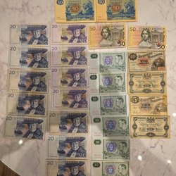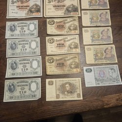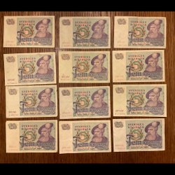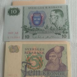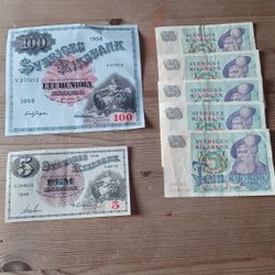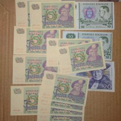 Svenska sedlar bestående av 4 st 5 kronors sedlar från 1978 och 1963. 5 st 10 kronors sedlar från 1958, 1959, 1989 och 1968.