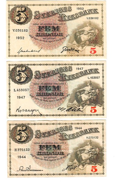 Tre stycken svenska sedlar. 1952 års sedel, värde 5 kronor, serienummer V.036182. 1947 års sedel, värde 5 kronor, serienummer L.453057. 1944 års sedel, värde 5 kronor, serienummer H.375132.