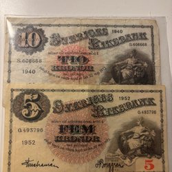 Två äldre sedlar. En femtio kronor sedel och en tio kronor sedel.