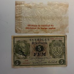 En svensk sedel med värdet 5 kronor från år 1948. Serienummer 0232604.