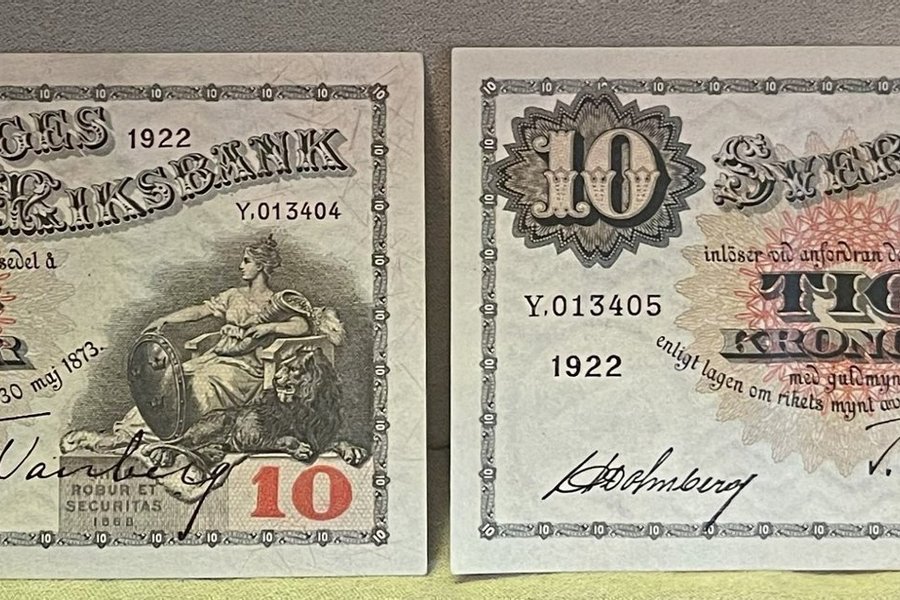 Svensk 10 kronor sedel från 1922 i nummerföljd. Serienummer Y.013404 och Y.013405.