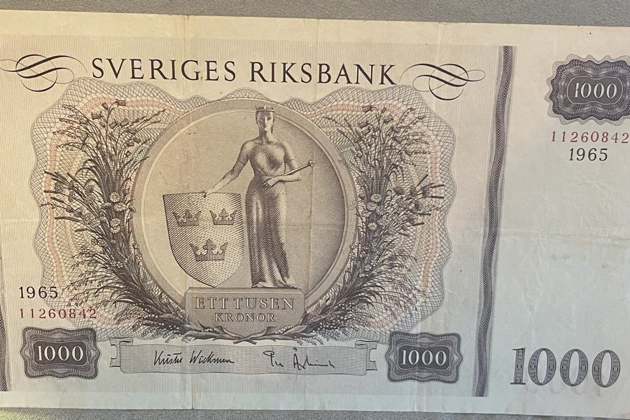 En svensk 1000 kronors sedel från 1965. Serienummer 11260842.