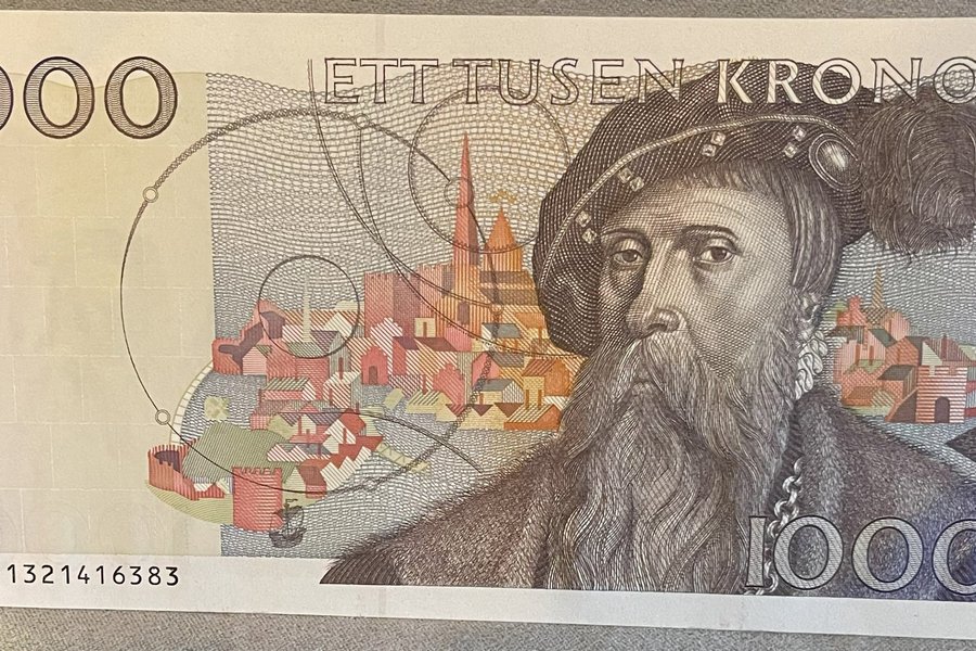 En svensk sedel med valören 1000 kronor 1991 ovikt. Sedeln har Gustav Vasa avbildad. Serienummer: 1321416383