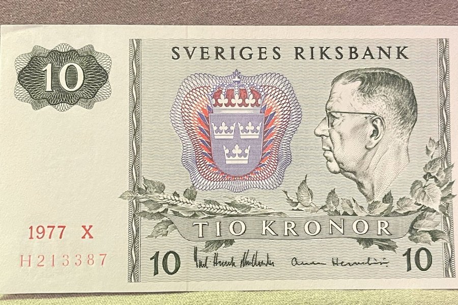 Svensk tiokrona sedel från 1977. Serienummer: H213387