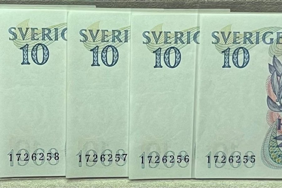 Samling av sju svenska 10-kronorssedlar från 1968. Serienummer inkluderar: 1726261, 1726260, 1726259, 1726258, 1726257, 1726256 och 1726255.
